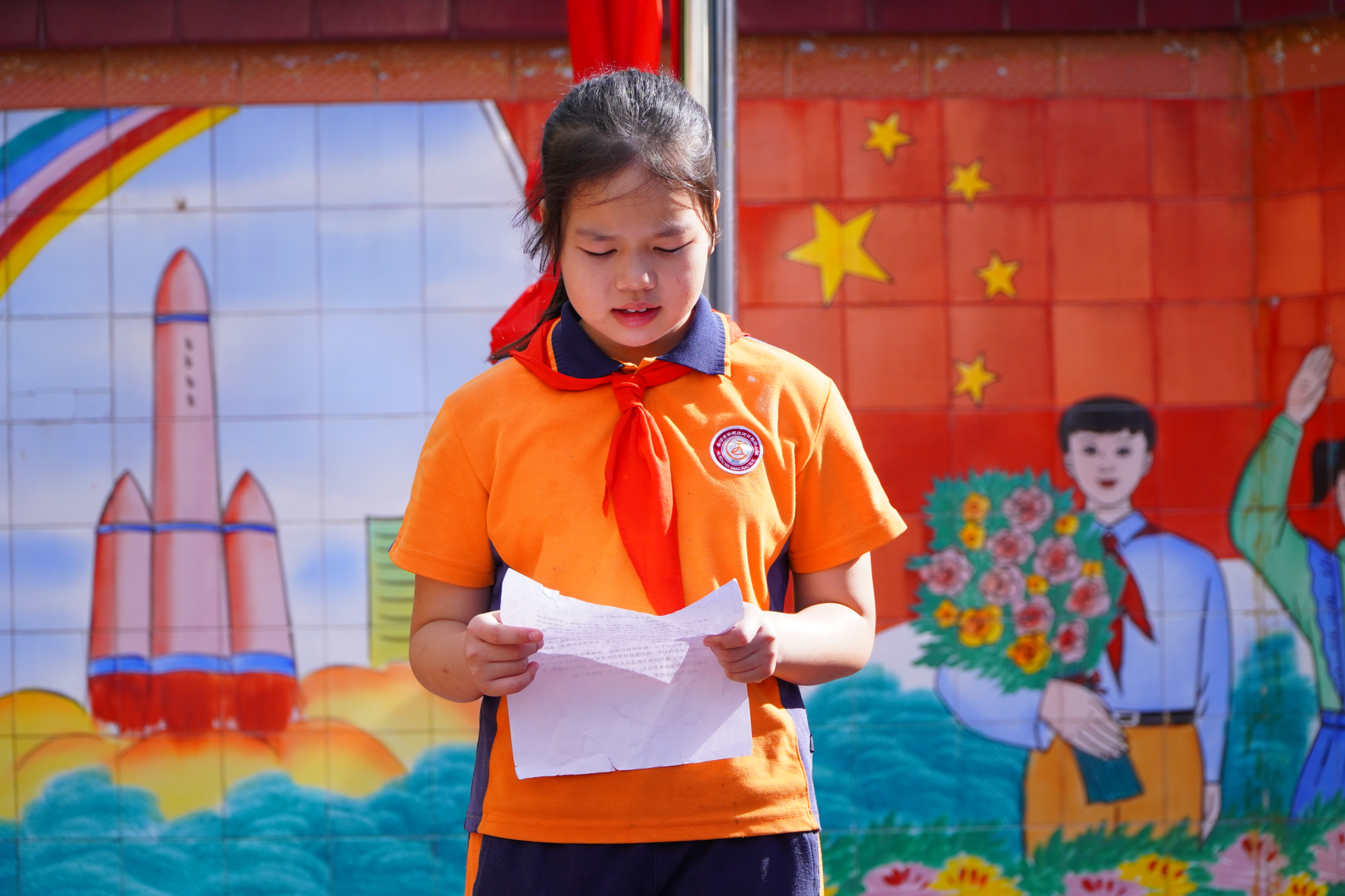 马岗小学少先队员卢依依同学在国旗下讲话。她说道,每个中国人都应该珍惜和感激祖国的培养与关怀。作为小学生,要努力学习,争做爱党爱国的新时代好少年,为国家的繁荣富强而努力奋斗。国旗护卫队代表李杰同学也分享了自己与国旗的故事。他勉励在场的所有同学,祖国的未来在于青年,青年们要矢志不渝地追求理想,不怕苦,不怕累,积极肩负起时代所赋予的责任与使命。