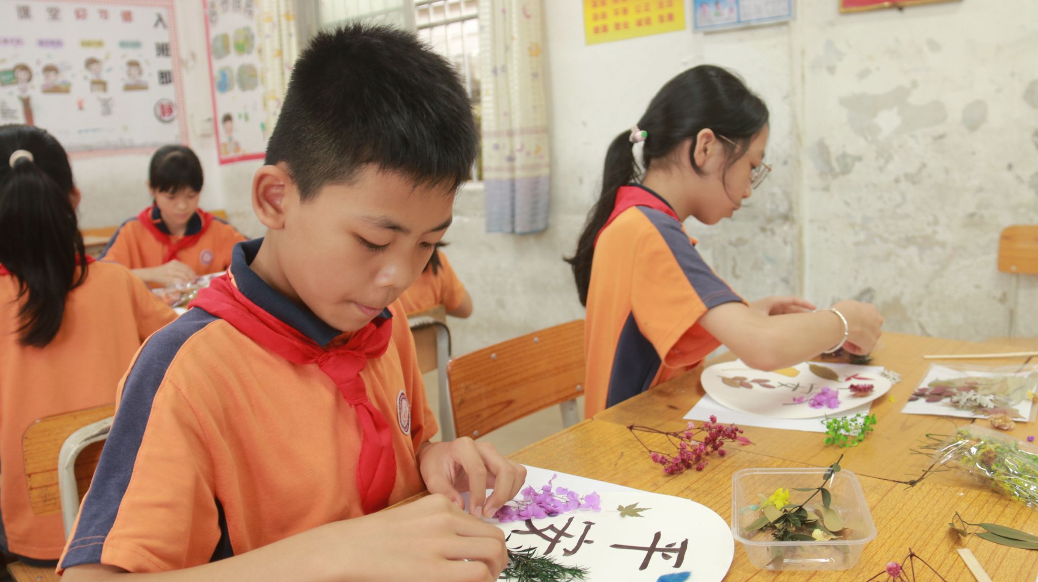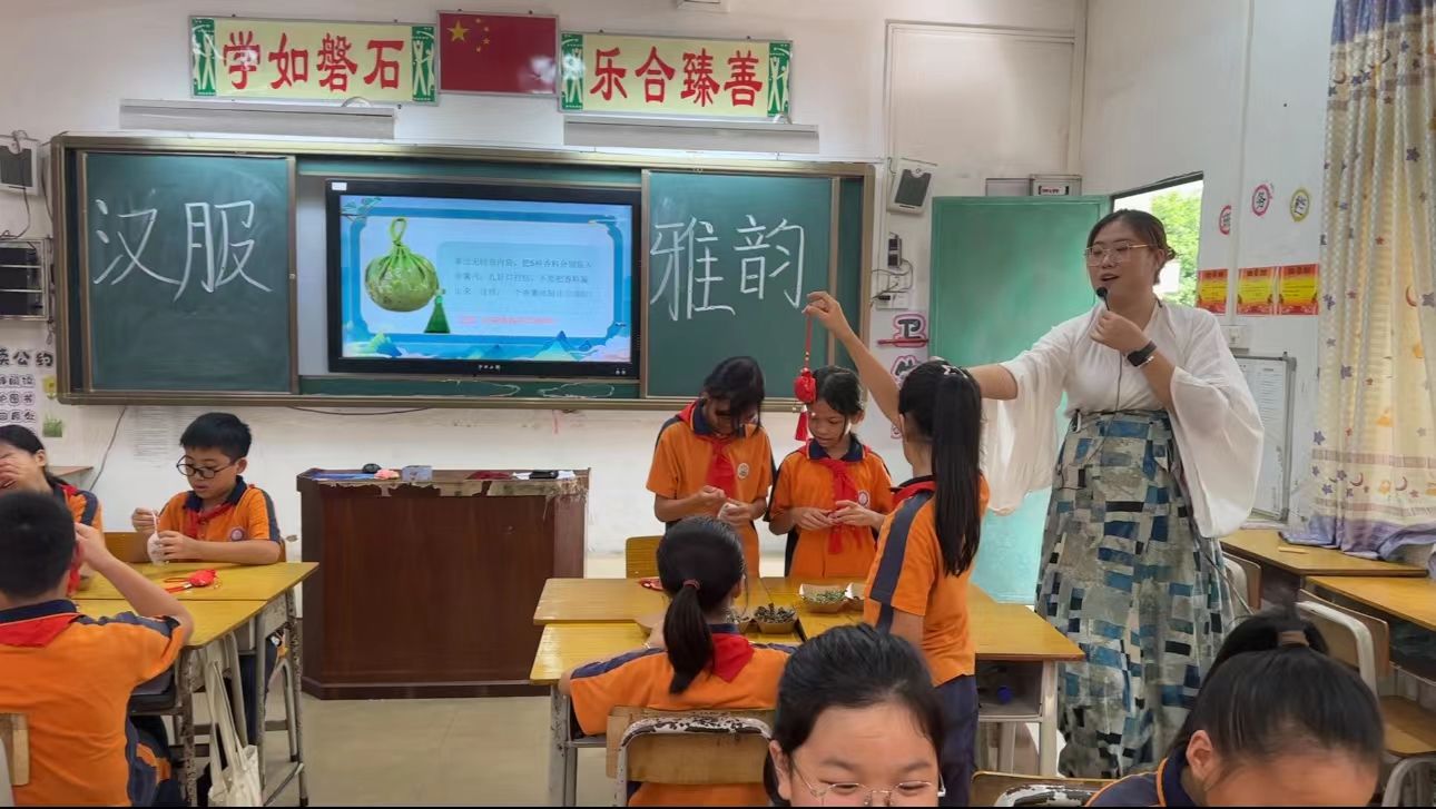 美育课程则以传统文化为重点,巧妙地将音乐与美术元素相结合,为学生们提供了一次深入了解和体验传统文化的机会。在奥尔夫音乐课堂《春晓》中,同学们通过演奏碰铃、三角铁等乐器,感受了《春晓》的节奏与韵律之美。在传统文化课堂《汉服雅韵,书扇飘香》中,课程设计充分考虑了不同年龄段学生的特点,分别安排了书法、团扇制作的学习内容和汉服观赏、香囊制作的体验机会。这些实践性的课程活动不仅让学生们亲身体验到了传统文化的独特魅力,也进一步增强了同学们对中华优秀传统文化的认同感和归属感。