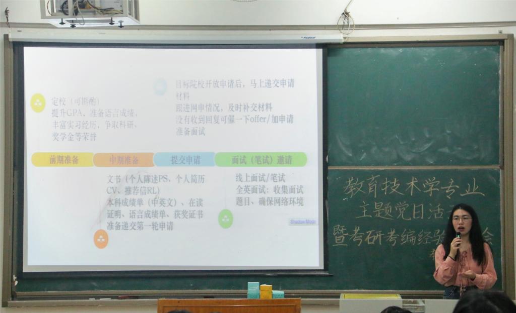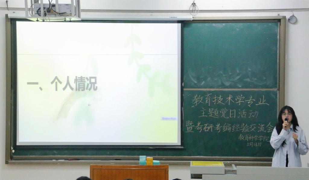 据悉,截止到分享会当天,教育技术学专业学生党支部即将毕业的7名正式党员和预备党员中已有6人考研考编成功。