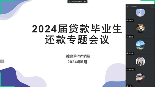 为帮助贷款毕业生了解生源地贷款的相关政策,指导他们做好还款计划以及熟悉还款流程。5月22日晚上8点,教育科学乐竞官网举办了2024届贷款毕业生还款指导专题线上会议。乐竞官网辅导员陈慧妍、梁少辉、朋辈辅导员龚碧莹以及2024届全体贷款毕业生参加了此次会议。