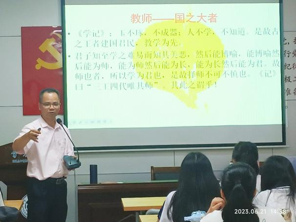 在讲座中,聂廷庆主任首先从《学记》和《师说》引入,向我们阐述了教师是国之大者,高质量教师更是高质量教育发展的中坚力量。接着,聂廷庆主任从精心备课、精心授课、精细化管理三个角度,结合自身的教学经验,生动形象地向我们讲解了作为老师应该具备的基本素养。在讲座的后半部分,聂廷庆主任向我们介绍了新教师、骨干教师、名教师、专家型教师的成长路径,并对我们师范生的专业成长提出相关建议,指出师范生应该从学习学科理论等基础理论知识入手,并付诸实践,经验加反思促进个人成长。