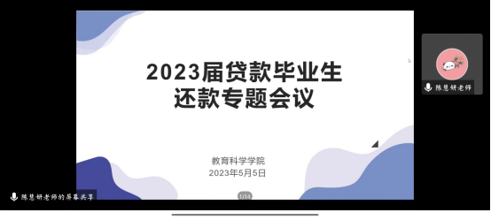 会议最后,陈慧妍再次强调按时还款的重要性,同时提出贷款毕业生们如果后续还有疑问可以在2023届贷款毕业生群里进行询问。本次会议为贷款毕业生们提供了清晰、规范的还款指引,为毕业后还贷工作的顺利开展奠定了良好的基础。