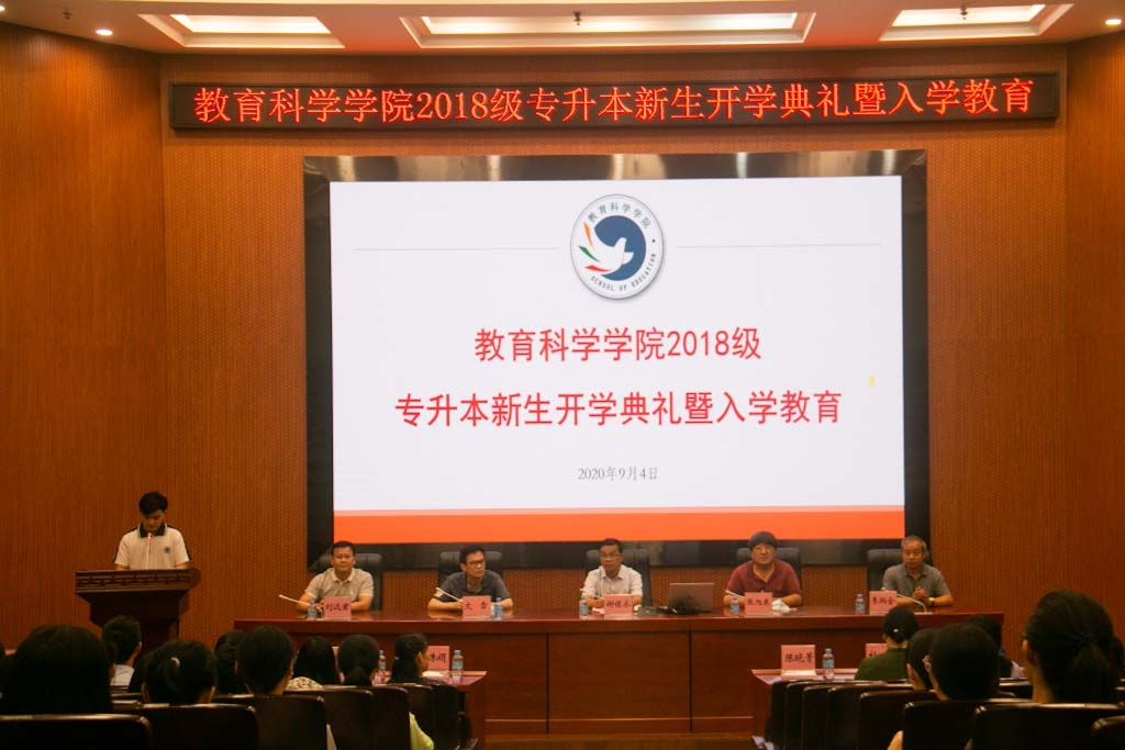 本网讯(通讯员/林雅婷 责编/何秀华)2020年9月4日晚上7:30,教育科学乐竞官网2018级专升本学生开学典礼在学术报告厅隆重举行。院党委书记谢佐永、院长张旭东、副院长文雪、副院长李炳全、院党委副书记刘远君以及各专业系主任、党政办公室副主任、辅导员,各专升本班主任、2018级全体专升本学生出席参加本次会议。