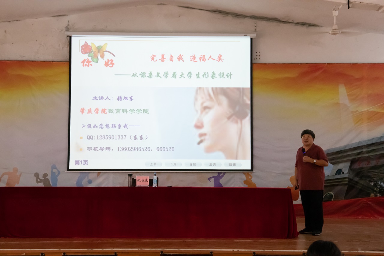9月21日下午,张旭东院长为新生进行大学生励志教育。张院长的讲座主题是《完善自我 造福人类——从课桌文学看大学生形象设计》,他结合丰富的人生阅历和三十余的从教经历,从“课桌文学”的微观角度,为大学生的四年学习、生活给予建议,并揭示了大学生在实现中国梦的伟大征程中的重要作用。