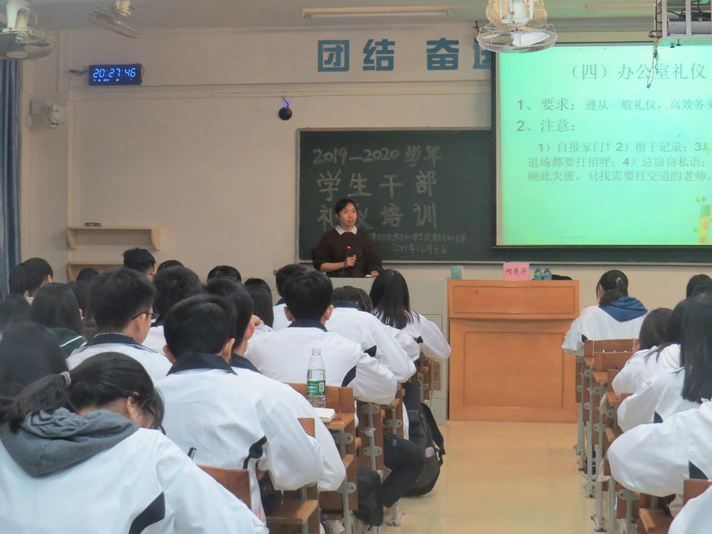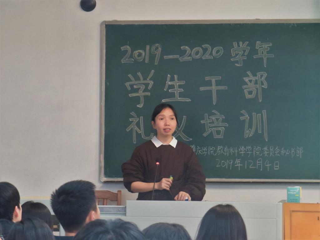 本网讯(通讯员/黎敏思 詹妮 拍摄/吴漫旋 责编/刘瑞雪)为提高教育科学乐竞官网学生干部的礼仪素养,乐竞(中国)一站式体育服务于2019年12月4日19:30在第二教学楼605室举办“2019-2020学年学生干部礼仪培训”专题讲座。乐竞官网专职组织员何秀华为本次培训讲座的主讲人。辅导员兼团委书记刘瑞雪、2019级各班团支书及六大学生机构的2019级学生干部共123人出席本次讲座。