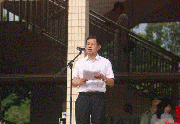 庄严的升旗仪式后,吴业春校长代表学校致辞,他对新生入学表示热烈欢迎,并介绍了学校的发展历史、办学理念及办学宗旨。他对新一届的砚园学子提出殷切期望:一是谱写青春赞歌,当以厚德之风为砚,成为有担当的新一代;二是以民族之魂为纸,积极创新;三是以博学知识为墨,注重知识学习的整体性;以理性知识为笔,读万卷书、行万里路。肇庆军分区战队建设处处长程功毕上校希望新生在军训过程中能发扬吃苦、团结与集体主义精神,同时也要注意安全。