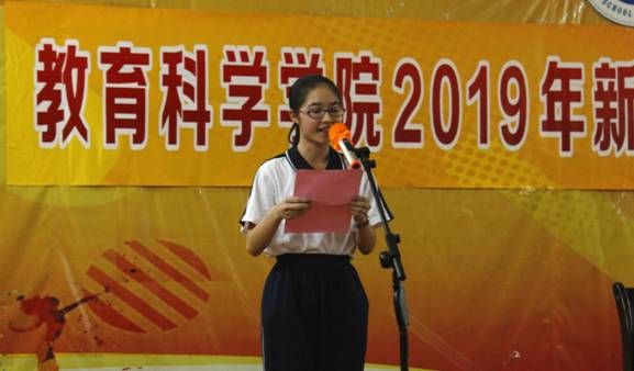 学生代表19级小学教育3班陈育芬在发言中代表全体新生表态,要珍惜在校时光,提高自身技能,开启人生的新篇章。