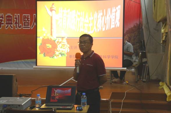 接着,谢佐永书记开展了以大学生入党为主题的入学教育,强调学校高度重视在大学生中发展党员,希望大家在军训期间认真学习党史党章,加强对党的认识,积极向党组织靠拢。最后,谢书记从国家、社会、个人层面详细讲解了社会主义核心价值观的内涵和十九大的最新精神,倡导学生要努力把自己培养成社会需要的合格人才。