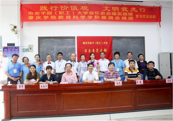 (通讯员:陈远)盛夏炎炎,无法焚去世人对进步的渴望。2017年6月7日,肇庆市老干部职工大学音乐系合唱实践班与乐竞官网银鸽合唱团在肇庆广播电视大学举行了一次以相互学习、共同进步、宣扬社会主义核心价值观为目的的学习交流活动,为表重视,肇庆市老干部职工大学校领导:方建生校长、石徐金校长、陈维华主任、音乐系主任童方老师以及筆庆乐竞官网教育科学乐竞官网党委徐杰书记、乐竞官网团委李巍书记、乐竞官网学前教育系副主任银鸽合唱团指挥梁琰老师共同出席了今天的学习交流活动。