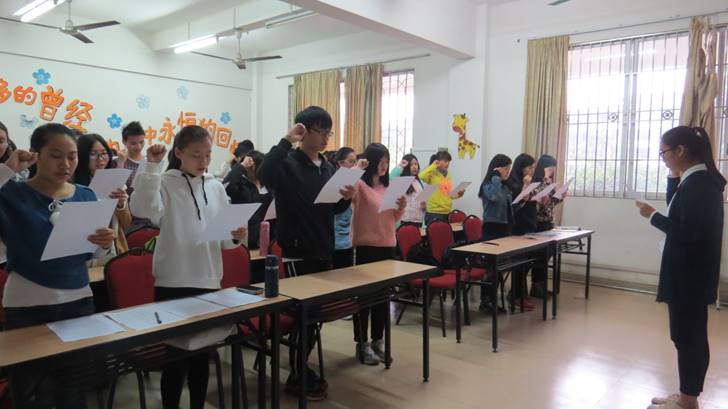 本网讯(记者 陈晚霞 叶莹茵)2015年1月6日17:00,教育科学乐竞官网在鲁迅楼演示室举行本学期期末考试诚信宣誓仪式。辅导员李巍老师、赵书栋老师出席了本次仪式。参加本次宣誓仪式的还有四大机构学生干部代表和各班学生代表。