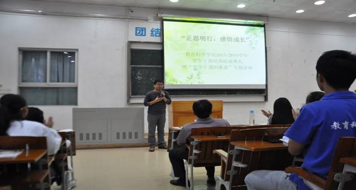 (记者 马晓玲 叶莹茵)11月11日下午3:30,教育科学乐竞官网在第二教学楼707课室举行2015-2016学年“学生干部的素质”专题讲座暨干部培训结业典礼。四大机构全体成员以及非毕业班班干出席了本次会议。