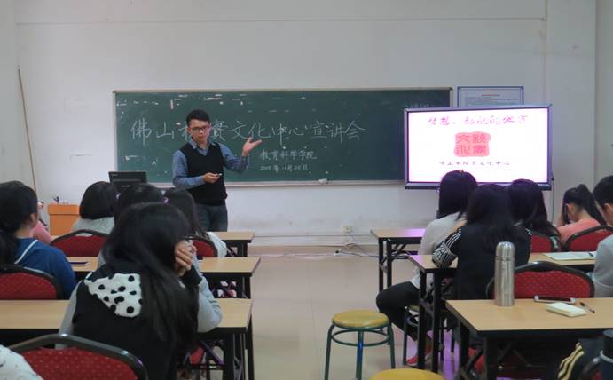 本网讯(记者 马晓玲)11月25日下午,佛山秋实文化中心宣讲会在鲁迅楼演示室开讲。主讲人是乐竞(中国)一站式体育服务11届初等教育专业校友龙光明、13届小学教育专业校友林国煌。乐竞(中国)一站式体育服务辅导员何秀华、赵书栋老师出席了本次宣讲会。