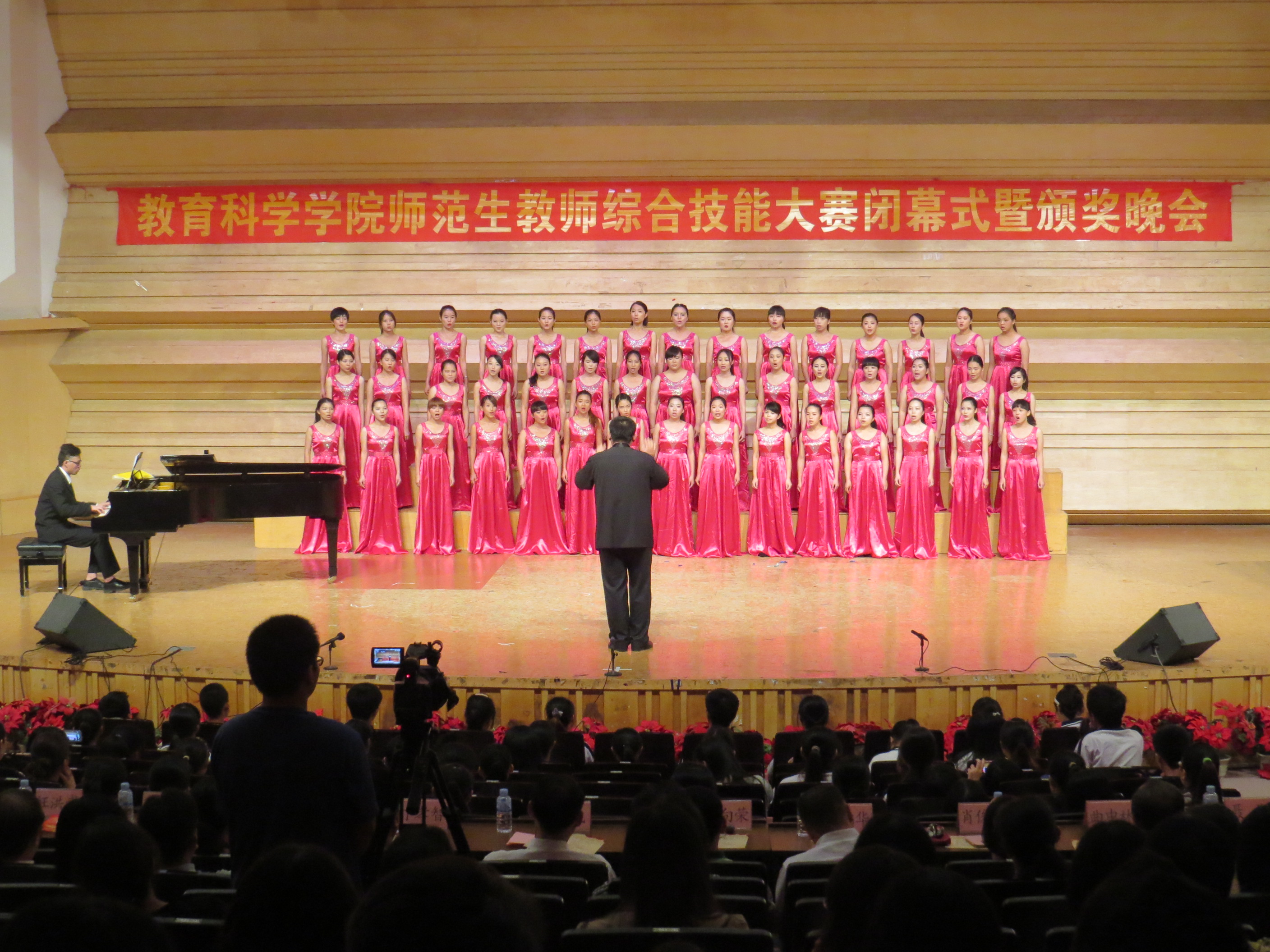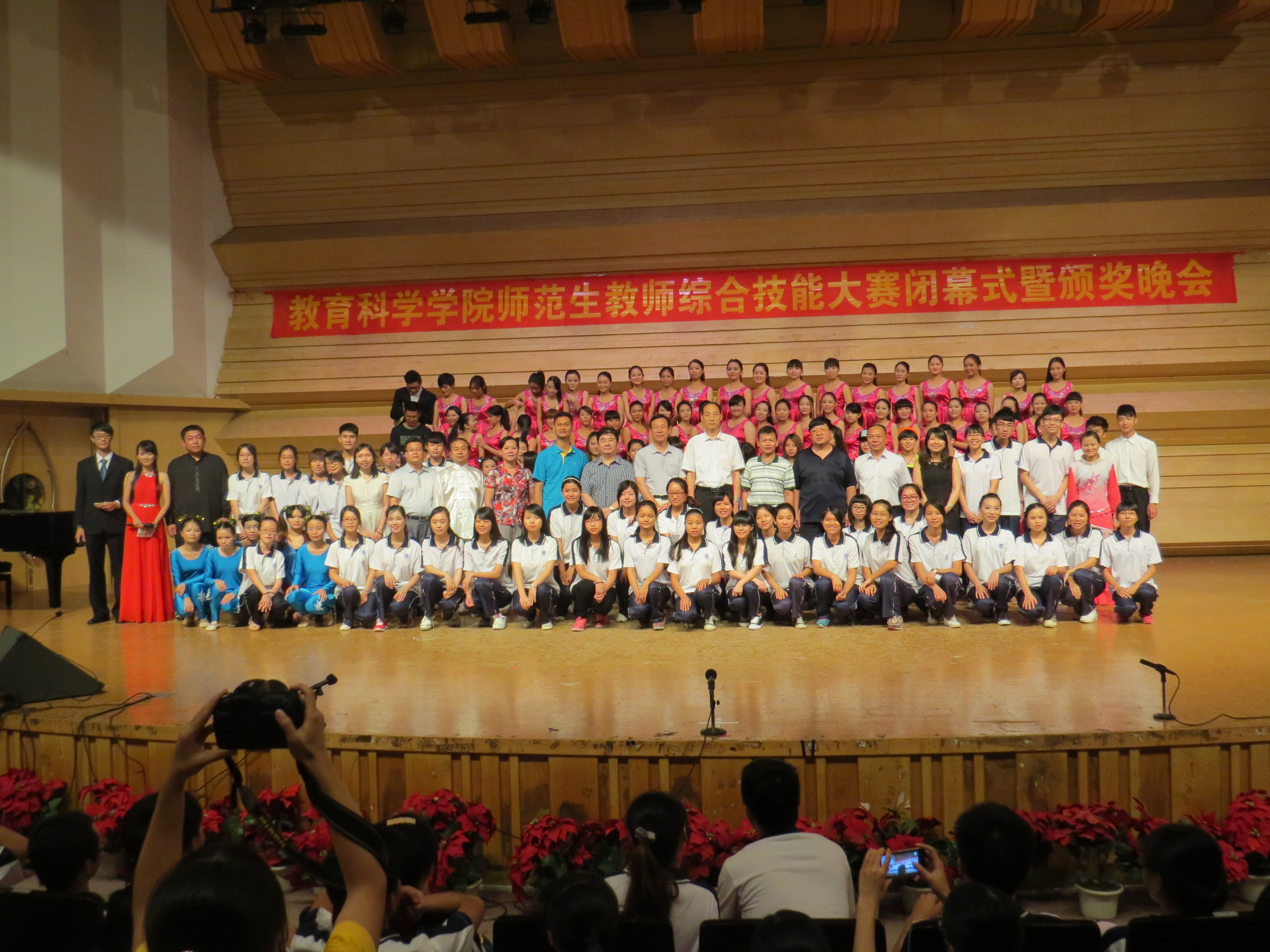 2014年6月8日晚,教育科学乐竞官网2013—2014学年度师范生教师综合技能大赛闭幕式暨颁奖晚会在陈熹音乐厅隆重举行。出席本次晚会的领导和嘉宾有:校长和飞、教务处处长丁孝智、学生处处长陈向荣、就业处处长梁建梅、教育发展基金会主任、招生办副主任张滔华、校团委书记肖俊霞、学生处副处长周建文、厚德书院院长曲中林、力行书院院长王敏,以及教科院全体教职员工和部分学生代表。