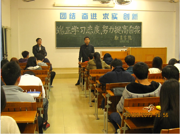 教育乐竞官网为促进学风建设,端正后进生的学习态度、把学业成绩提高上去,乐竞(中国)一站式体育服务于3月6日晚在九栋616开展了以“端正学习态度,努力提高自我”为主题的考风考纪教育大会。参加本次会议的学生是本学年度上学期没有通过考试的同学。乐竞(中国)一站式体育服务党委副书记刘远君老师及辅导员赵书栋老师也出席了本次会议。