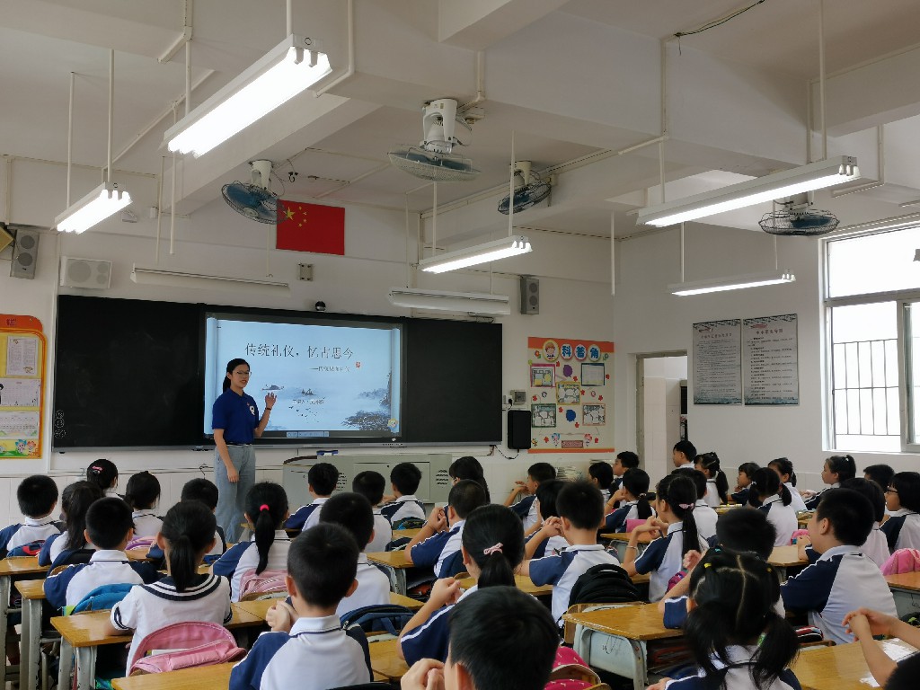 志愿者义教主要面向七小三年级二班全体学生开展,义教活动环节紧凑且内容丰富,干货满满。首先由义教组志愿者吴丹娜进行传统礼仪--见面礼仪教学。志愿者讲解“跪拜礼、作揖礼和拱手礼”三种礼仪的正确动作,区分男女见面礼仪。学生们抬手、弯腰,举手投足间感受着传统礼仪文化的熏陶。除此之外,同学们还在讲台上展示自己的学习成果。让同学们在亲自示范过程中能正确认识传统礼仪之中的见面礼仪,更加了解和热爱祖国的传统文化。