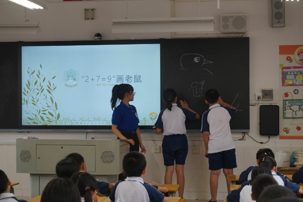 由义教组志愿者林绮彤进行简笔画教学。通过简单卡通漫画的形式,现场示范“2+2=4画鸟”“2+7=9画老鼠”……志愿者笔下的一个个栩栩如生的卡通形象深深吸引着学生们的注意力,同学们纷纷拿出纸和笔动手实操。