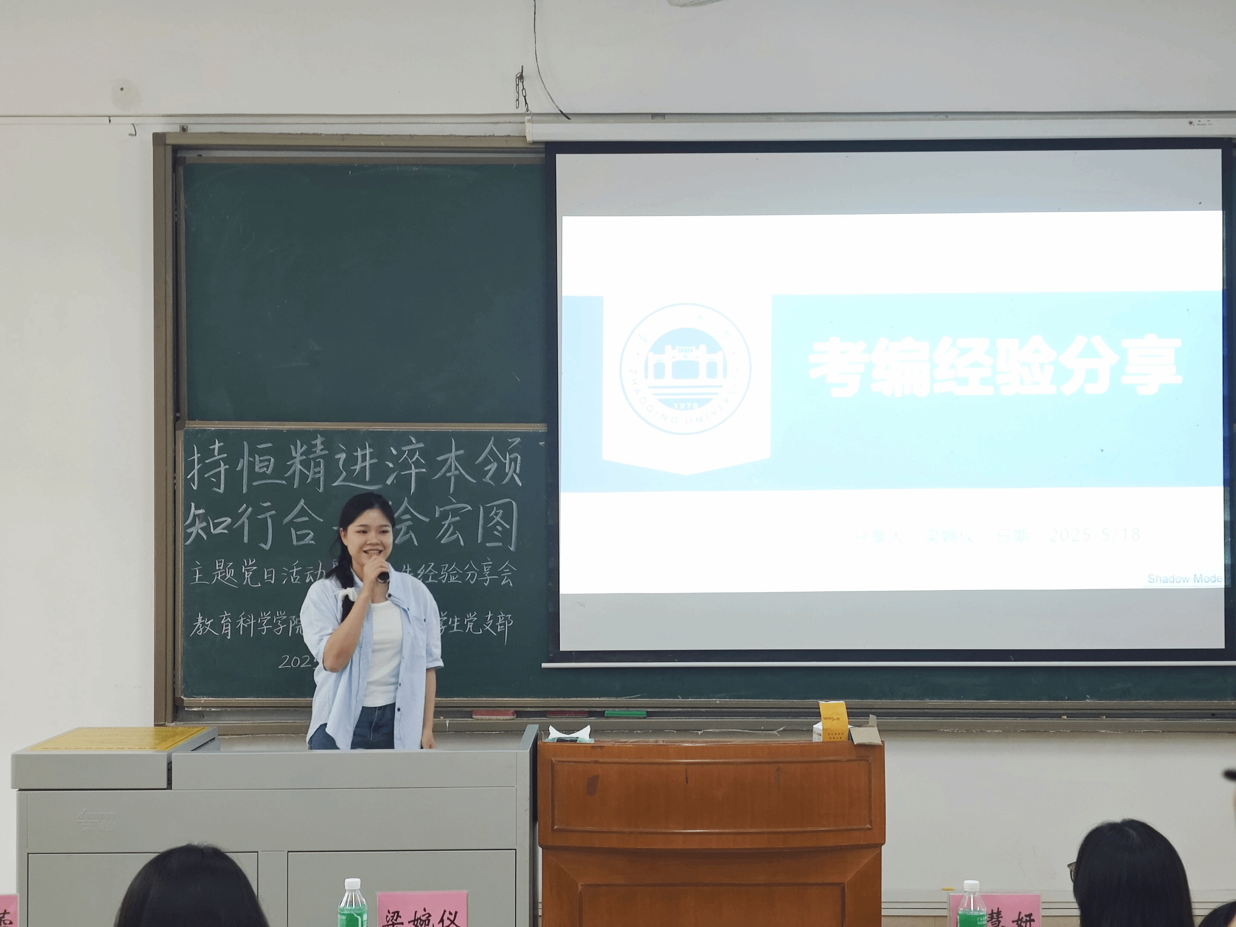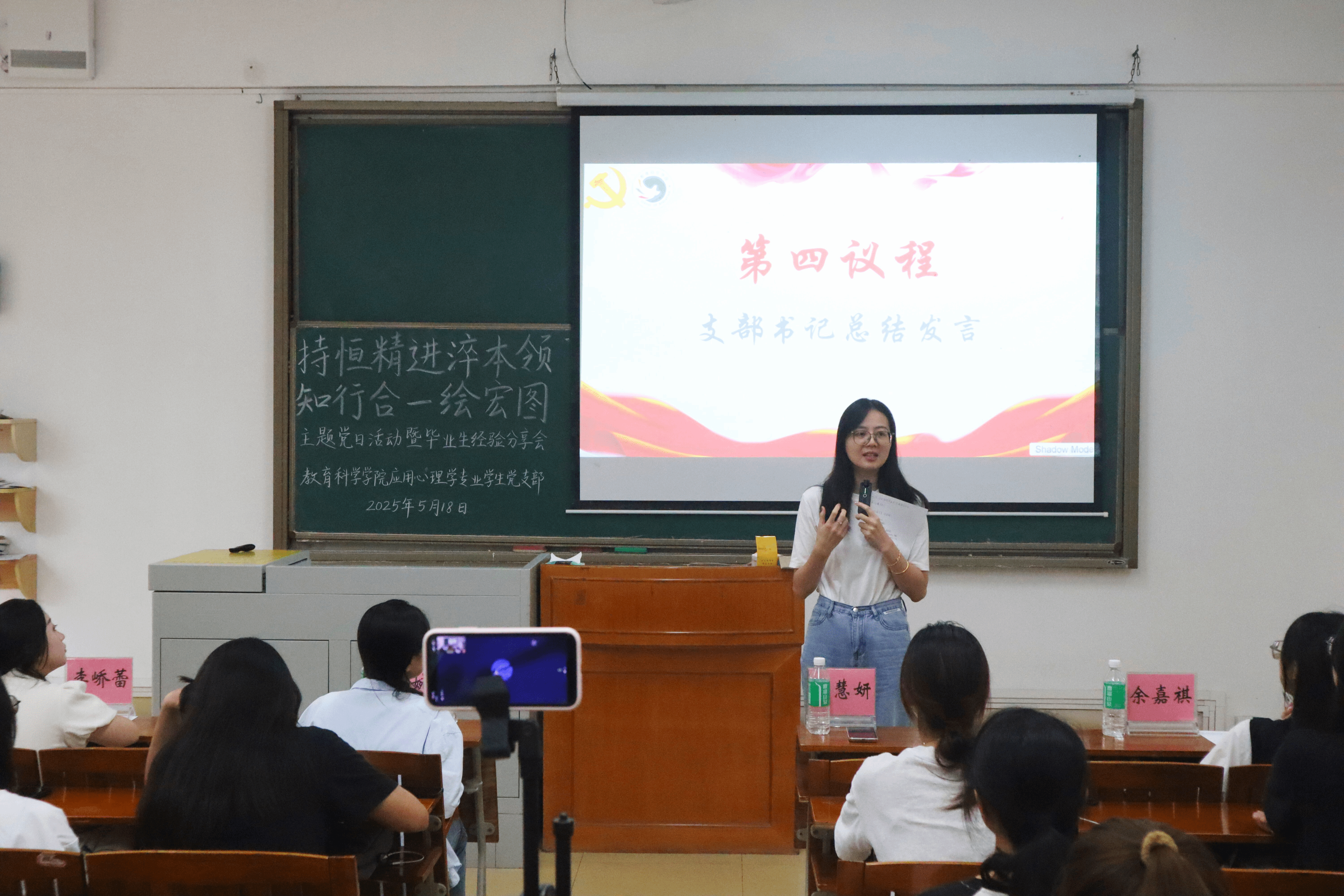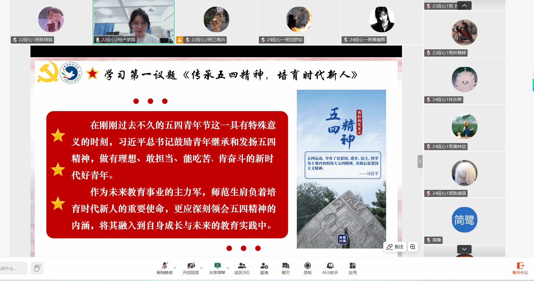 在第一议题环节,主持人卢彦园与林莉莉分别引领全体同学学习研讨 “传承五四精神,培育时代新人”与“深入贯彻中央八项规定精神学习教育”内容,旨在引导新时代师范生争做有理想、敢担当、能吃苦、肯奋斗的新时代好青年。他们强调,师范生作为未来教育主力军,要以“严以治学”为基石,以“德”润心为前提,以“行”践知为关键,促进自身成长并投身中国式现代化的教育实践。