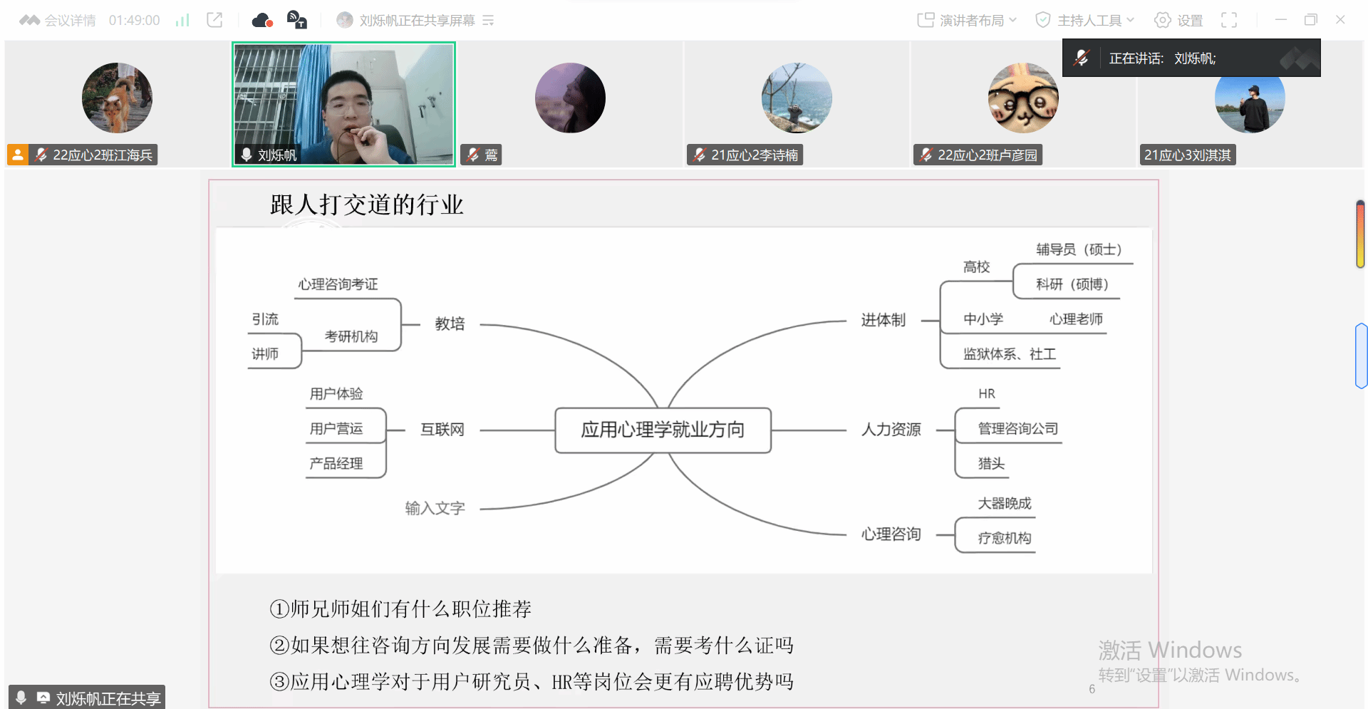 就业方面,刘烁帆介绍了人力资源六大板块和三支柱模型下的 HR 工作特点,并分析不同就业方向的薪资待遇和发展前景。李峤蕾重点分享求职方法,以自身实习经验说明面试要点与职场技巧,鼓励大家拓宽视野。