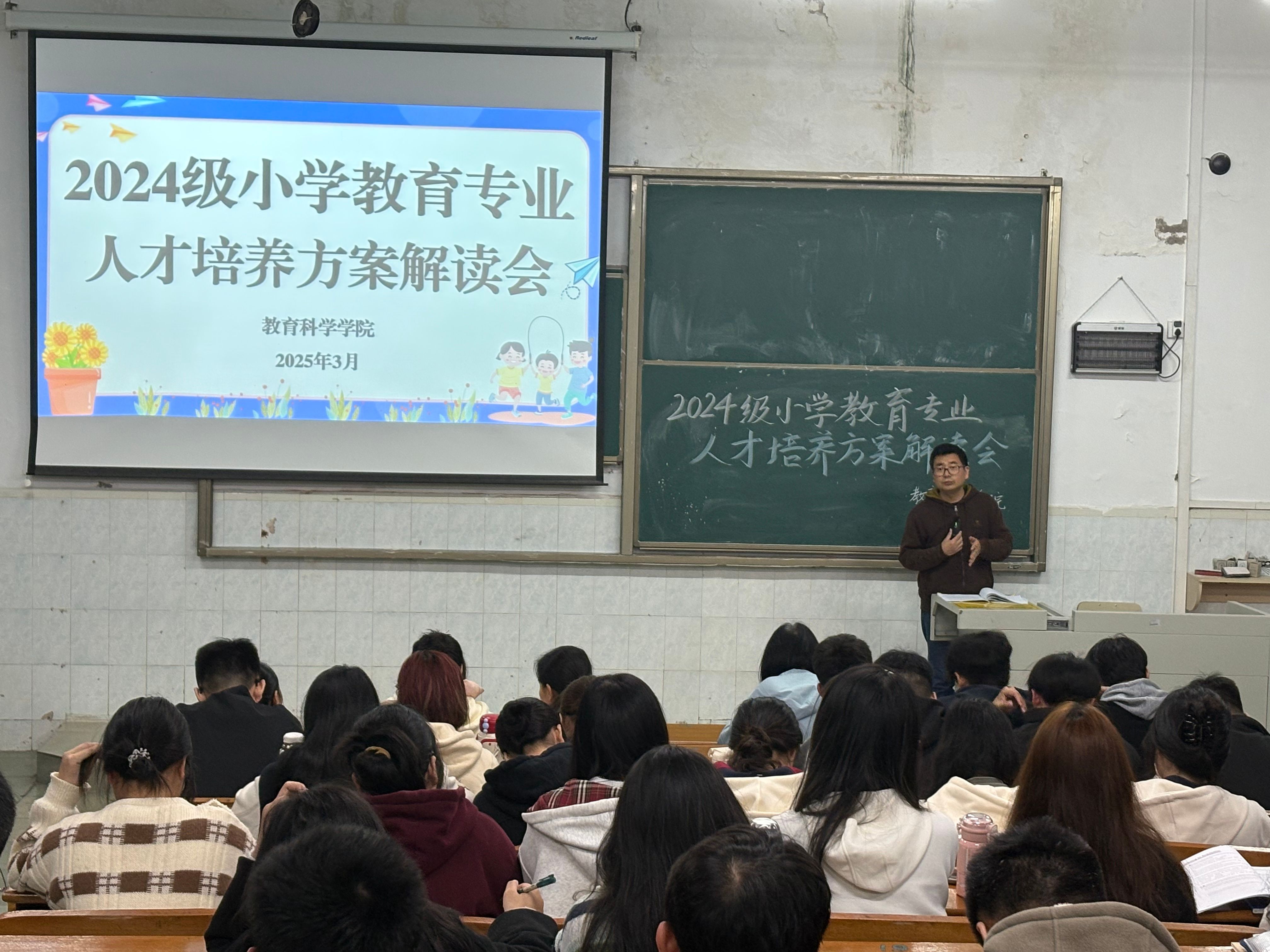 本网讯(通讯员/李俏汝 许小珊 责编/刘瑞雪)2025年3月5日,在星湖校区17-108教室举办了2024级小学教育专业人才培养方案解读会。小学教育专业系主任赵书栋、专任教师林琦、24级年级辅导员刘瑞雪出席会议,150名24级小学教育专业学生参加会议。