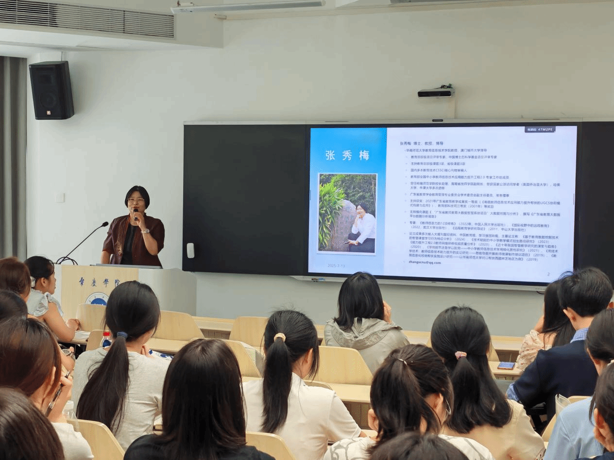 讲座中,华南师范大学教授张秀梅以“新课改理念下AI赋能的教师备授课技巧”为主题,深度剖析人工智能技术在教学准备与实施环节的理论基础和应用逻辑,为研究生理解智慧教学工具赋能教学创新提供专业视角。