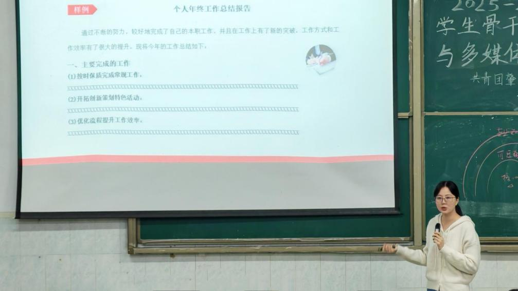 培训中,陈慧妍老师系统地讲解了公文种类、格式规范、行文规则等基础知识,并结合实际案例,重点分析了通知、工作总结与计划、新闻稿等常用公文文种的写作结构、核心要点与注意事项。她指出,公文写作是一项重要的可迁移技能,准确掌握不同文种的逻辑与规范,对提升工作的专业性与时效性具有重要意义。培训尾声,陈老师以“时时有所创造,事事有所成就,处处有所精进”作为结语与同学们共勉,鼓励学生骨干将学习成果转化为实际工作能力,做到学以致用、勤思笃行,不断提升业务水平与综合素养。
