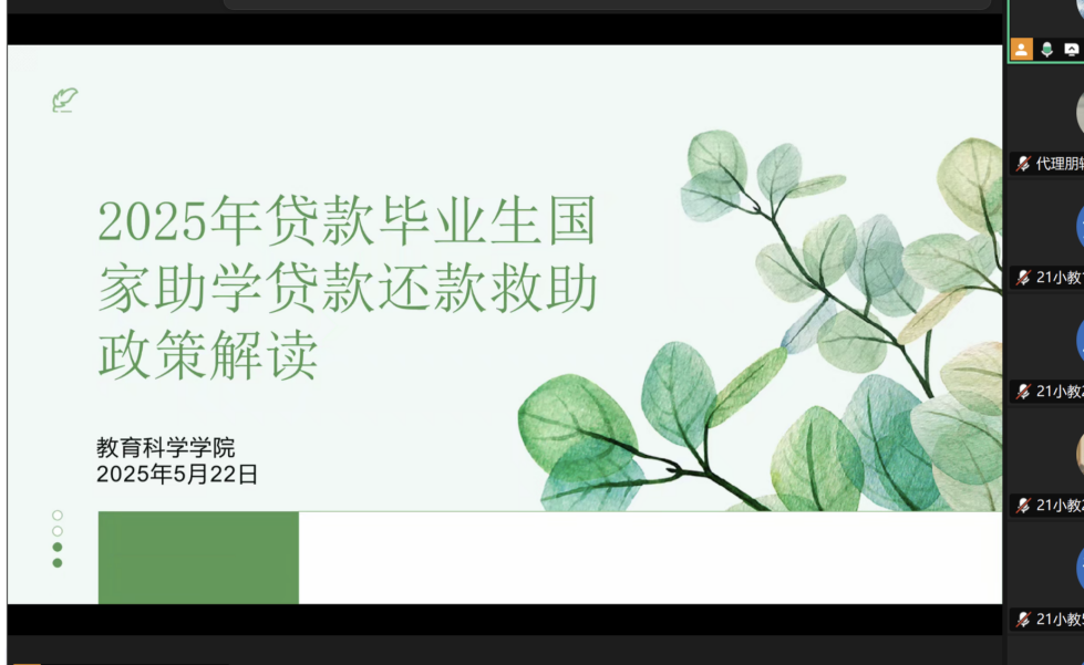 为进一步帮助贷款毕业生了解还款相关事宜、国家助学贷款还款救助相关政策,以及提高“诚信履约,按时还款、谨防诈骗”的意识,教育科学乐竞官网于5月22日举行2025届贷款毕业生还款指导主题线上会议,内容包括“诚信及防诈教育”、“还款指导”、“国家助学贷款还款救助政策解读”。乐竞官网辅导员梁少辉老师、朋辈辅导员吴莹莹及2025届全体贷款毕业生参加此次会议。