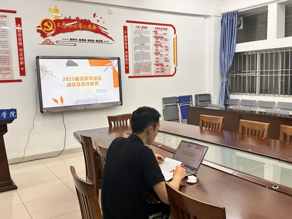 在诚信及防诈教育专题会议中,梁少辉老师强调个人征信与贷款毕业生的利害关系,增强贷款毕业生的诚信履约意识,让贷款毕业生更加深刻认识到及时履约还贷的重要性和违约后果对个人征信的影响。同时介绍了几种识别非法校园贷的方法,告诫大家要时刻保持警惕,提高防诈意识。