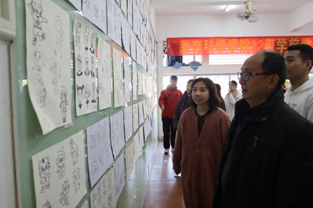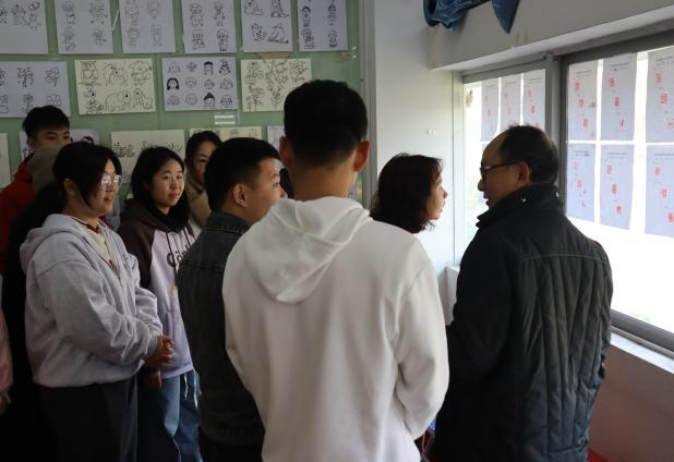 在参观过程中,领导老师们认真欣赏学生们的作品,深入探讨每幅作品所蕴含的多元风格、创意源泉以及背后的深层意义。